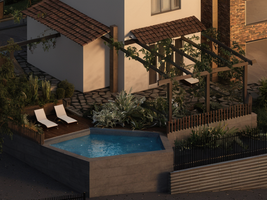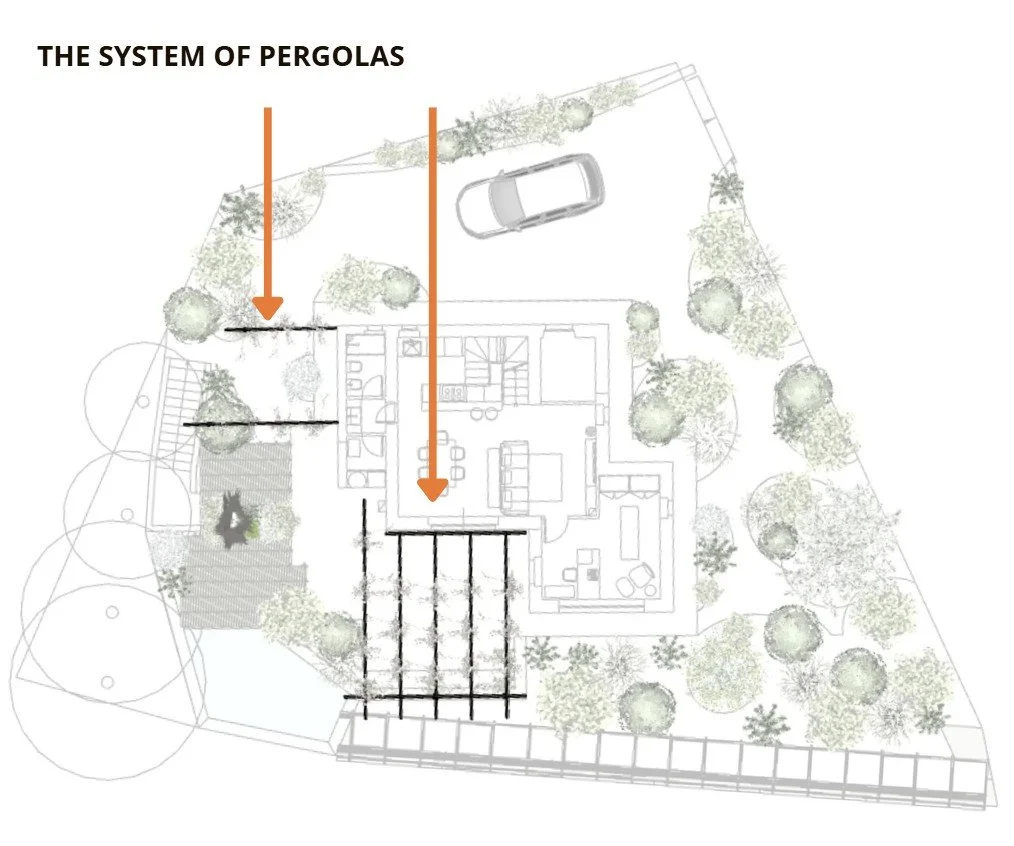 I designed a sequence of pergolas that accompany movement through the garden: beginning close to the house along the path toward the central area, creating an invitation to enter. Then they pause, opening the space to light and air near the relaxation zone between the pool and the deck. Finally, they reappear in the dining area, where shade becomes essential during the hottest hours of the day.