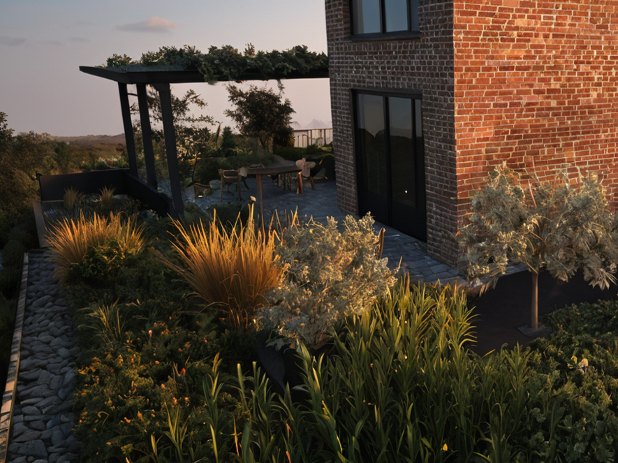 Plant selection follows a Mediterranean language suited to the local climate, inspired by naturally occurring plant communities, with low water requirements and balanced maintenance needs.