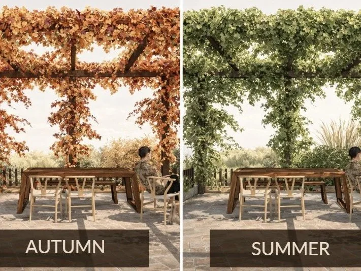 She longed for a garden that would feel welcoming, with spaces that offered protection without ever feeling enclosed — much like the garden of her mother in Australia. In the photographs she shared with me, vertical elements appeared again and again — tree trunks, posts, light structures — surrounded by greenery and light. They conveyed a sense of grounding, of gentle shelter.