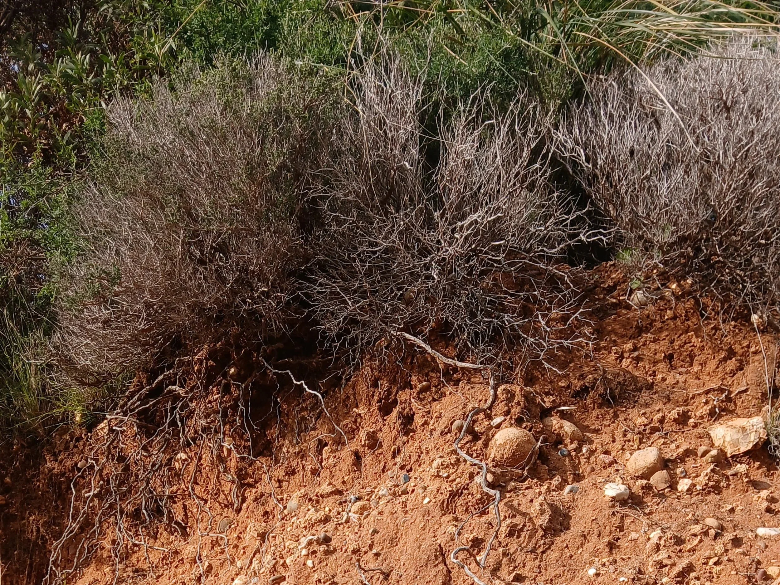 One of the most fascinating associations to me is the one between Ephedra fragilis and Juniperus oxycedrus subsp. macrocarpa. Ephedra is slender and brittle — it snaps easily, which explains its name. The juniper, by contrast, has the dense texture of a conifer, a more irregular structure, and extremely slow growth: about ten centimeters per year. I observed them on the back dunes of the “Foce del Fiume Platani” nature reserve on Sicily’s western coast.